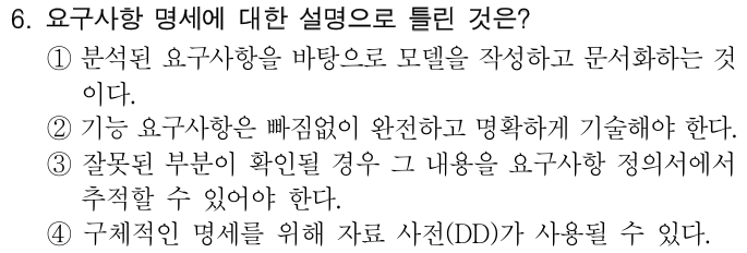 4번) 자료 사전(DD)은 구조적 분석 기법에서 데이터 흐름을 정의하는 도구이다. 요구사항 명세 시 구체적인 명세(상세 기능 정의)를 위해 직접적으로 사용되는 표준 도구는 소단위 명세서(Mini-Spec) 입니다.