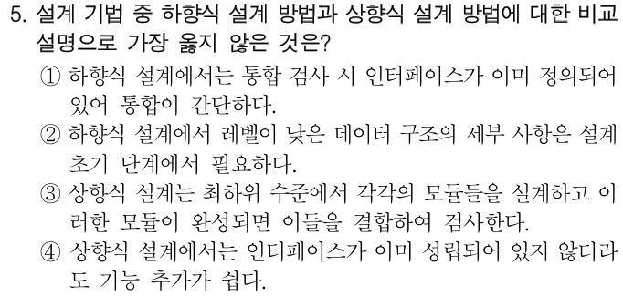 4번) 상향식 설계(Bottom-Up)는 최하위 모듈을 먼저 개발한 후 이를 결합하여 상위 모듈을 만드는 방식. 이 방식은 각 모듈이 이미 완성되어 있어야 하므로, 인터페이스가 사전에 명확하게 성립되어 있지 않으면 모듈 간의 결합이나 기능 추가가 매우 어렵다.