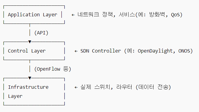 | 핵심 개념 | 네트워크 기능(예: 방화벽, 라우터 등)을 소프트웨어로 가상화 | 네트워크 제어를 중앙 컨트롤러(소프트웨어)로 분리 |