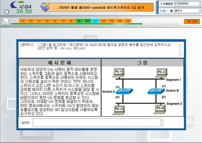 케이블 작업, 윈도우 서버, 리눅스 명령어, 네트워크 지식, 라우터 명령어가 시험범위이고 11문제 이상 맞춰야 합격이다.
